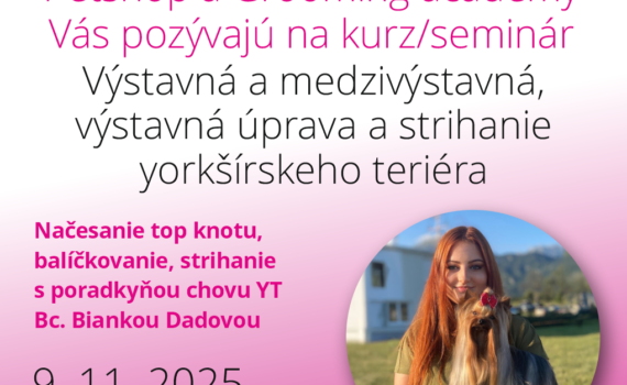 Pozyvame vas na kurz/seminar vystavnej a komercnej upravy yorkšírskych teriérov. Ako sme uz avizovali, spajame sa len s najlepsimi a preto sme pozvali slečnu Bc Bianku Dadovu – hlavnu poradkynu chovu yorkov na Slovensku. Dakujeme, ze takato profesionalka prijala nase pozvanie a ze Vam bude moct predat svoje dlhorocne skusenosti. […]